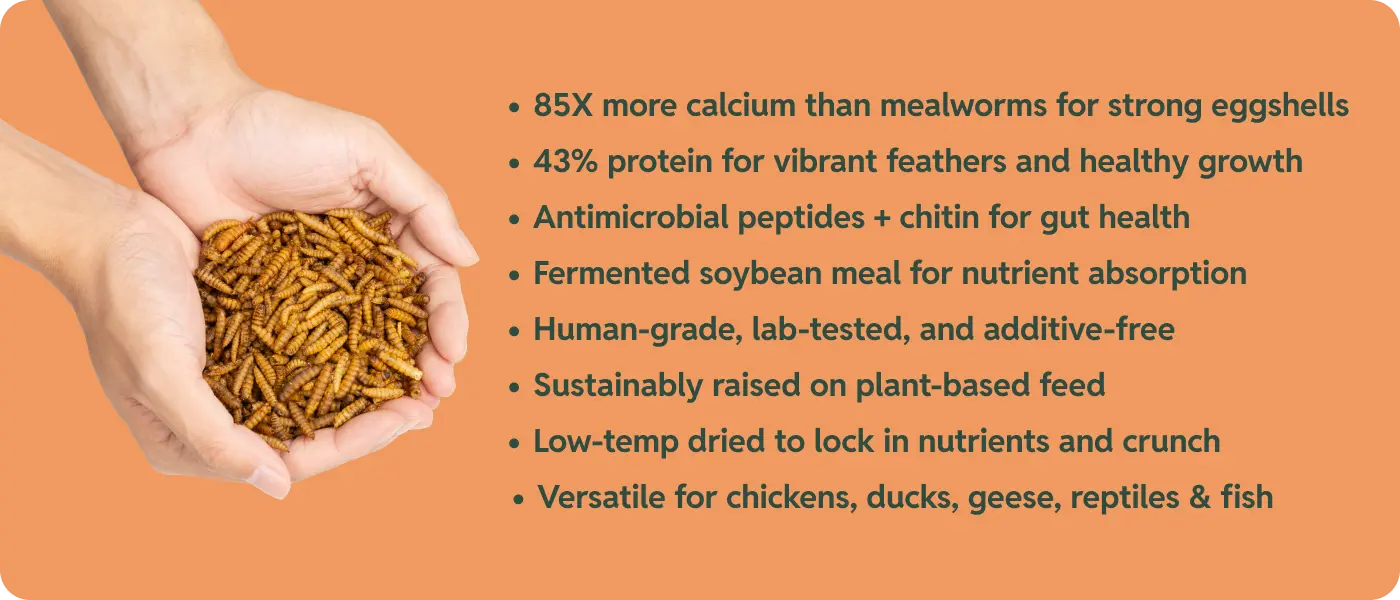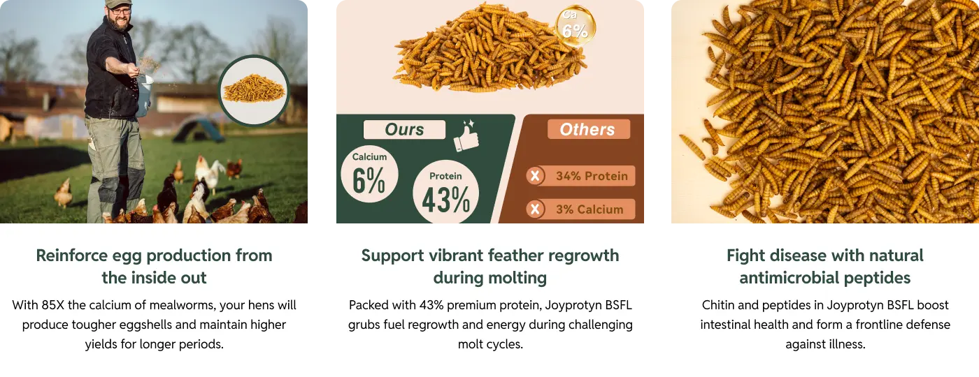 At JoyProtyn, we transform sustainable ingredients into high-value nutrition for your flock. Our Black Soldier Fly Larvae (BSFL) redefine poult.